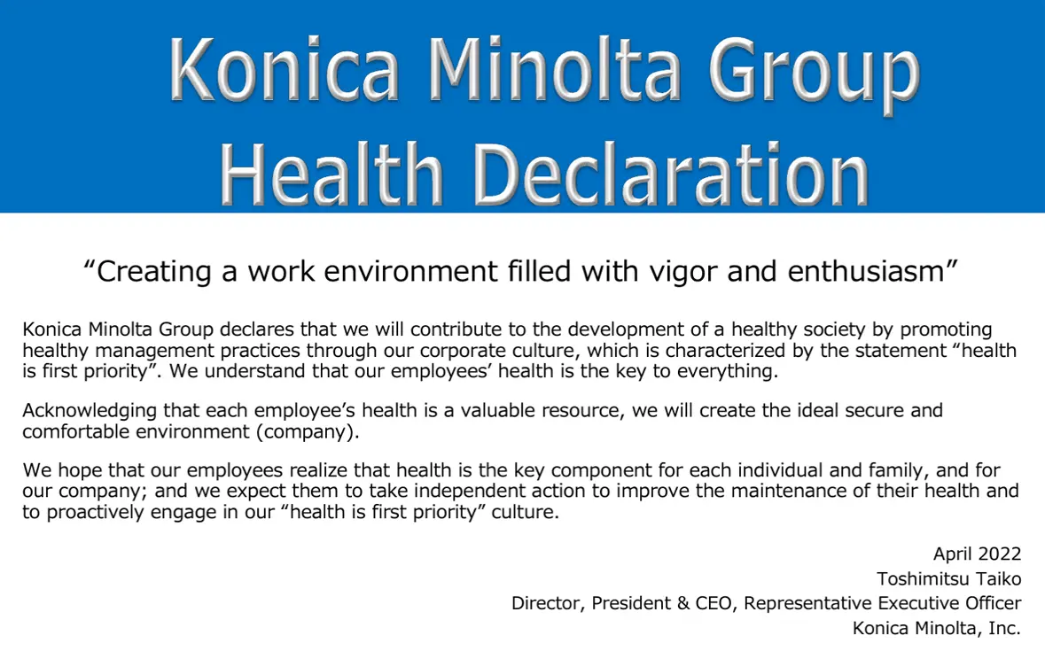Konica Minolta has issued a statement on health, the Konica Minolta Group Health Declaration, which sets out the principles for promoting health & Productivity management. Based on this declaration, it plans and implements policies under a single management structure (collaborative health) so that the best use can be made of Company resources and its Health Insurance Association. The Company is enthusiastically implementing health-promotion measures while practicing swift decision-making on important issues in cooperation with the Leader of the Health Promotion Group of Human Resources Department, the Executive Director of the Health Insurance Society, and other management personnel, with the General Manager of the Human Resource Department concurrently serving as Chairperson of the Health Insurance Society, and the HR Health Promotion Leader concurrently serving as Executive Director of the Health Insurance Society.