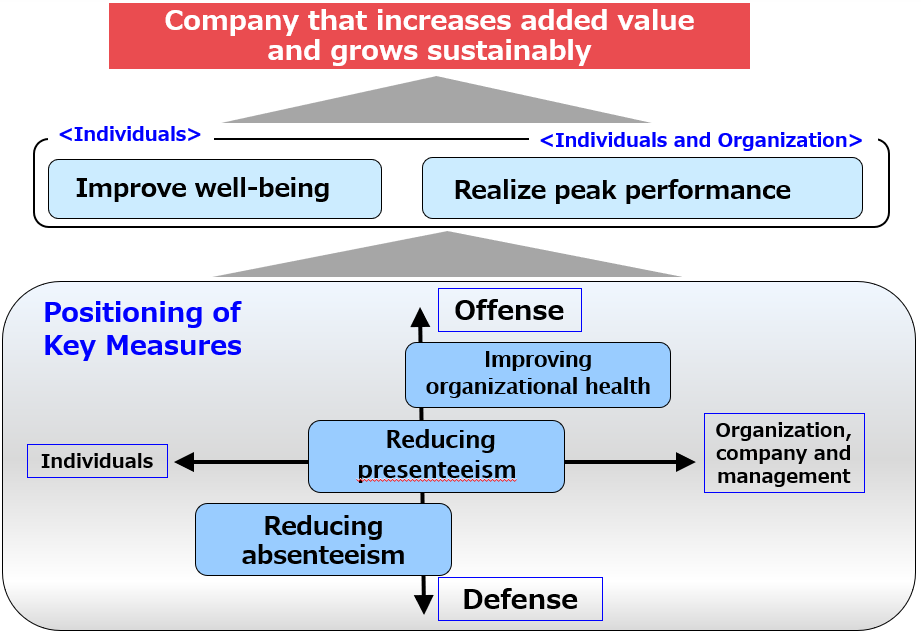 We seek to achieve our vision by quantifying and promoting improvements in organizational health and reducing presenteeism and absenteeism (*) to improve corporate productivity and dynamism.