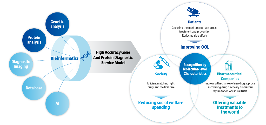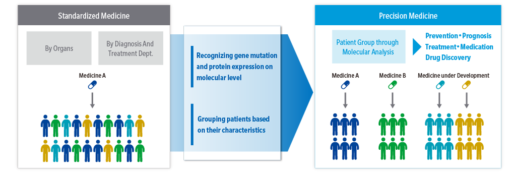 Precision medicine shows promise for use against cancer and other conditions for which treatment often involves a high susceptibility to adverse genetic and constitutional effects. Anticancer drugs, despite being expensive and carrying the risk of side effects, are said to have response rates between 20% to 30%. A greater proliferation of precision medicine will allow doctors to choose more effective treatments that carry fewer side effects, helping to improve patients' quality of life. Moreover, pharmaceutical companies will also be able to more efficiently develop drugs with higher response rates, while also shortening drug development time and costs, leading to lower drug prices. In addition, early detection and more efficient treatment will prevent long recuperation times and help to cut healthcare costs across the board.