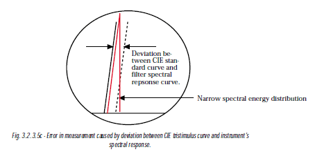 Nevertheless, matching to the standard CIE tristimulus curves can be achieved only with finite accuracy. Deviations will occur in the defined CIE curves and in the sensitivity curves of the measuring instrument. These differences are negligible as long as the light to be measured exhibits a continuous energy output over the entire visible spectrum. However, the error may be significant if steep edges or spectral lines occur in the spectrum. Hence, three-filter colorimeters are not usually suited to measure light sources with spectral lines, e.g., discharge lamps (refer to Fig.3.2.3.5a), or with narrow spectral energy distributions, e.g., LEDS (refer to Fig.3.2.3.5b).