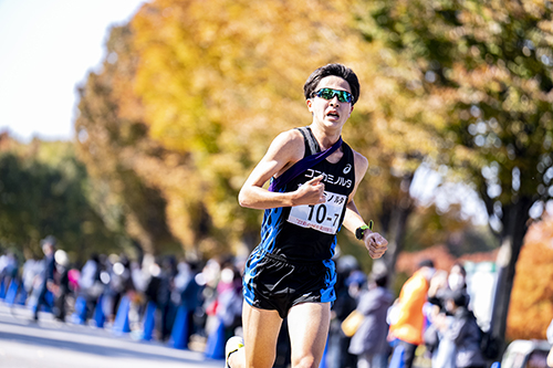 ルーキーとして12.9kmのアンカー区間を託された宮下選手。序盤は大山選手の勢いをもらってJR東日本の竹井祐貴選手を引き離しますが、中盤で竹井選手が追いつき、しばらく並走状態に。終盤8km過ぎ、相手のしかけに対応し切れず、順位を落としてしまいます。それでも最後まで粘りの走りを見せて10位を確保。ニューイヤー駅伝への切符は死守することができました。