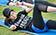 ガラスのピラミッドから陸上競技場まではウォーミングアップを兼ねてジョグで移動。緑の芝生や円錐形のモエレ山など、美しいランドスケープを楽しみながらゆっくりと走ります。到着したのは競技場前の広大な芝生エリア。ここで、蜂須賀選手の主導で軽い準備運動。膝の屈伸や前屈、肩回しなどで全身をほぐしました。