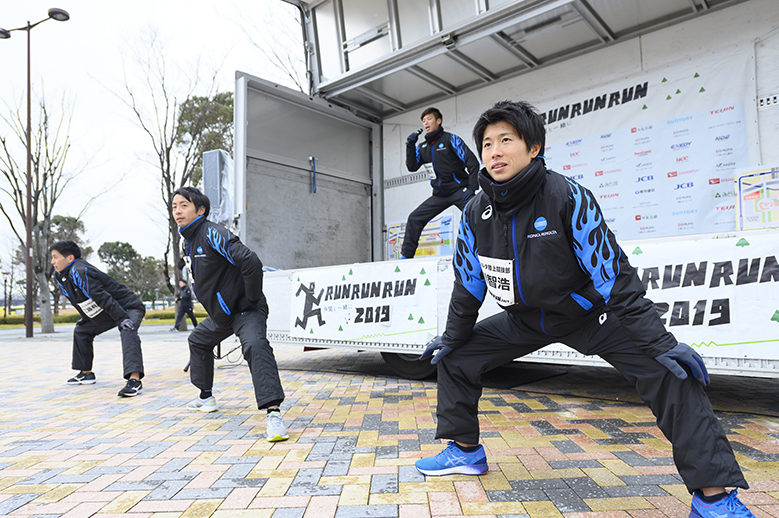 レース前、選手たち、参加者のみなさんは、スタート&ゴール地点すぐ横に設置されたステージ前へと移動。MCの白戸太朗さんと安田大サーカス安田団長の紹介で、ステージに上がった選手4人は、レース前に体をほぐす動的ストレッチを主導。西池選手のリードとともに、他の3選手がお手本を披露。参加者の間をまわってていねいにアドバイスをしながらの指導が好評を博しました。