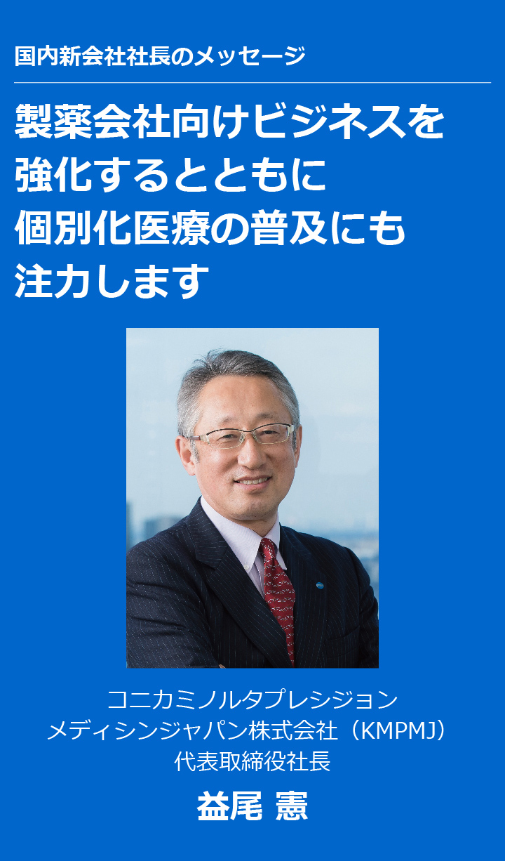 さらに2018年には、日本での事業体制を強化するため、コニカミノルタプレシジョンメディシンジャパン(KMPMJ)を設立しました。今後、日米の強力な事業体制のもと、病院市場向けと製薬市場向けのサービスを拡大し、個別化医療のグローバルリーダーを目指します。