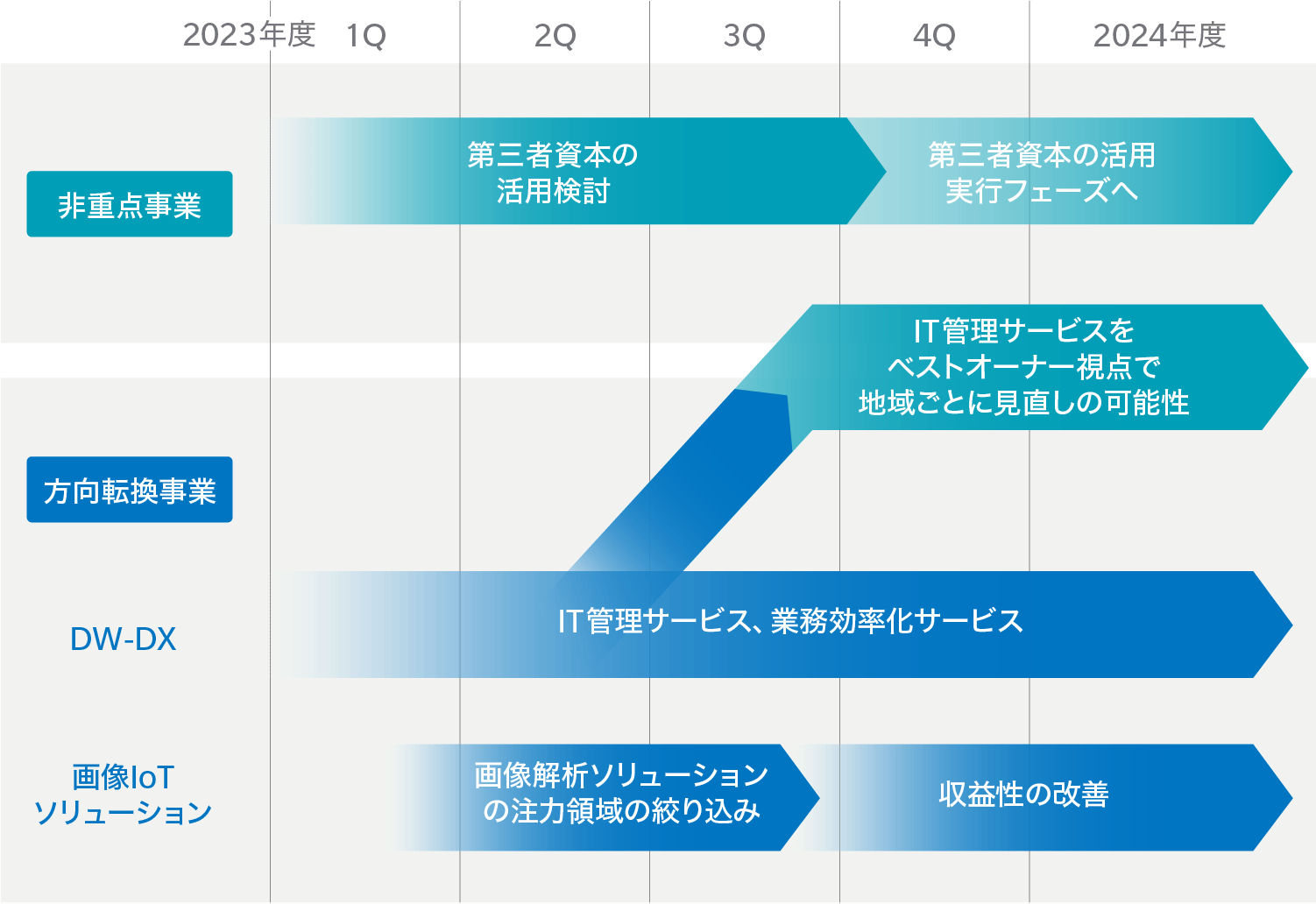 「方向転換事業」としたDW-DXのIT管理サービスと業務効率化サービスのうち、オフィス事業とのシナジーが限定的、かつ開発リソースが限られているIT管理サービスについて、ベストオーナー視点も選択肢として地域ごとに見直しの可能性について検討を進めていきます。画像IoTソリューションについては、今後は画像解析ソリューションの注力領域を欧州、米国のアウトドアおよびサーマル活用領域に絞り込み、収益性改善に向けた取り組みを加速させます。