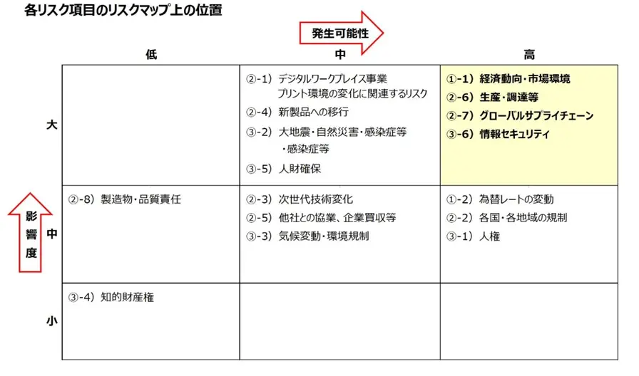 また、コニカミノルタは、リスクを「組織の収益や損失に影響を与える不確実性」と捉えております。リスクを単にマイナスの側面からだけではなく、「機会」としてのプラスの側面からも捉えたうえで、リスクマネジメントを「リスクのマイナス影響を抑えつつ、リターンの最大化を追求する活動」と位置付け、収益の源泉としてリスクを管理するため、そのマイナスとリターンのバランスに重きを置いたリスクアペタイトに考慮した取組を行っております。