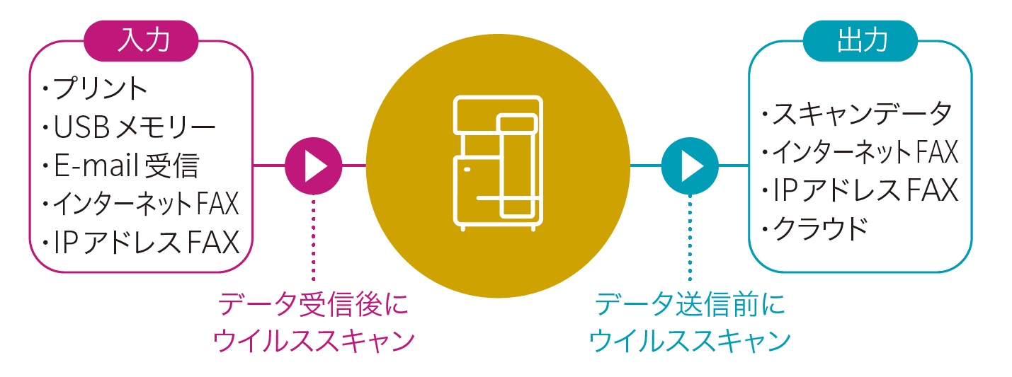 ネットワークに接続して様々なデータを入出力する複合機では、セキュアな使用環境が求められます。C4051iと4051iには、Bitdefender社のスキャンエンジンをベースにした強固なウィルススキャン機能をオプション*4で追加することが可能です。データの受信後と送信前にウィルススキャンをファイル単位で行うことで、ファイルに感染したウイルスを検知し、拡散を未然に防ぎます。さらに、定期的に複合機内のファイルをチェックし、潜在しているリスクを検知します。