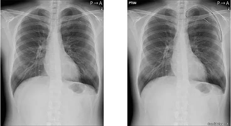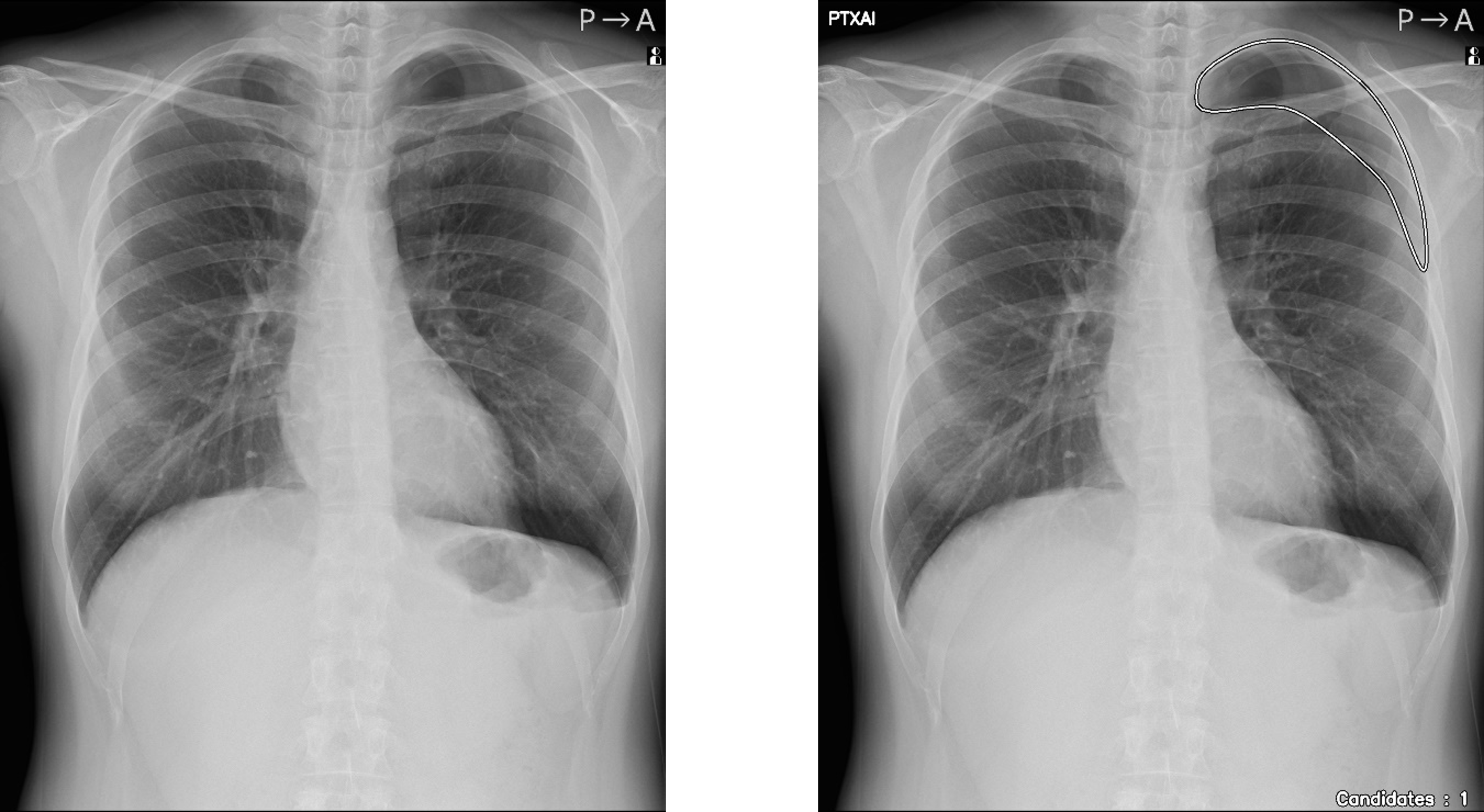 気胸とは、何らかの原因で肺に穴が開き、肺がしぼんでしまう状態を指します。胸の痛み、咳、息切れや呼吸困難などの症状を伴うことがあり、緊張性気胸に進展した場合には生命に危険が及ぶ可能性があります。そのため、早期発見・診断が重要ですが、胸部単純X線画像撮影の主目的が気胸の確認ではない場合は見落とされるリスクが高い所見でもあります。