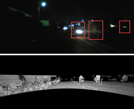 3D LiDARは、カメラが苦手とする夜間、太陽光やヘッドライト等の屋外のシーンにおいても、高い検知性能を有しています。